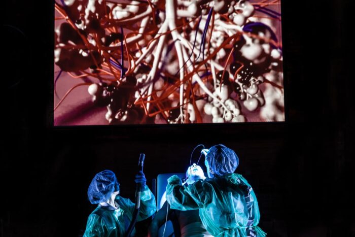 – Jak daleko jesteśmy w stanie nagiąć ludzkie ciało, żeby pasowało do algorytmu? Twórcy, wykorzystując świat naszkicowany przez Aldousa Huxleya, przedstawiają parodię Doliny Krzemowej. Organizują całą akcję w centrum laboratoryjnej przestrzeni. W czasie mocno odjechanego eksperymentu, wcielają aktorów w role inżynierów własnych ciał. Ekipa pseudomedyczna liczy kroki, oddechy i kalorie, aktualizuje oprogramowanie mięśni itd. Lekarze i pielęgniarze a w końcu i ci badani przez nich pacjenci wyciskają ze swoich organizmów ostatnie poty. Jednocześnie zwiększają swoje możliwości cudami techniki. I tak na przemian.