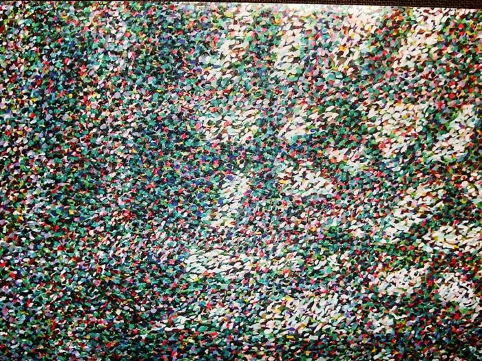 Pierwsza praca, która mnie ujęła, nosi świąteczny tytuł „Gwiazdka z nieba”, – to olej z sztyftami olejnymi na płótnie. Drugą pracę ta sama artystka zatytułowała „Wielka kapusta” (olej na płótnie). Pomyślałam: – No też przyda się na święta. Proszę Katarzynę Dyjewską, autorkę tych dzieł, spośród kilku innych na wystawie, by się nie obraziła za ten nie najmądrzejszy wtręt. Refleksyjne akryle na płótnie Marleny Promnej, acz bardzo spokojne, nie mają najczęściej tytułów. Pełne niepokojów i temperamentu są splecione w różne figury geometryczne dzieła z różnych metali i plastyku Anny Bujak. Najbardziej ujęło mnie dzieło zatytułowane „Serbia aż po Tokio”. Lecz najwięcej czasu zajęło mi wielokrotne wpatrywanie się w rozedrgany akryl na płótnie Dominiki Kowyni podpisany tajemniczo „Połowa drogi”. Połowa czyli ile jeszcze do końca pozostało kobiecie? Czy w ogóle ten koniec będzie?