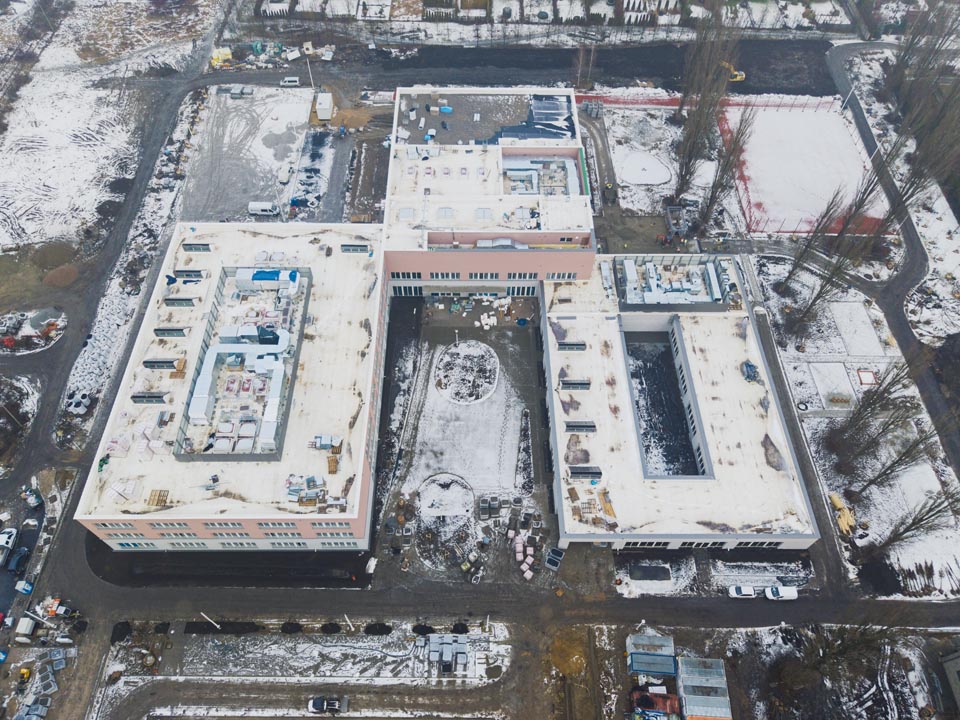 Inwestycja weszła w etap robót wykończeniowych. Na placu budowy codziennie pracuje ponad 100 osób. W budynkach trwają prace malarskie, układane są wykładziny, rozpoczął się montaż wyposażenia zaplecza kuchennego oraz rozruch instalacji centralnego ogrzewania.