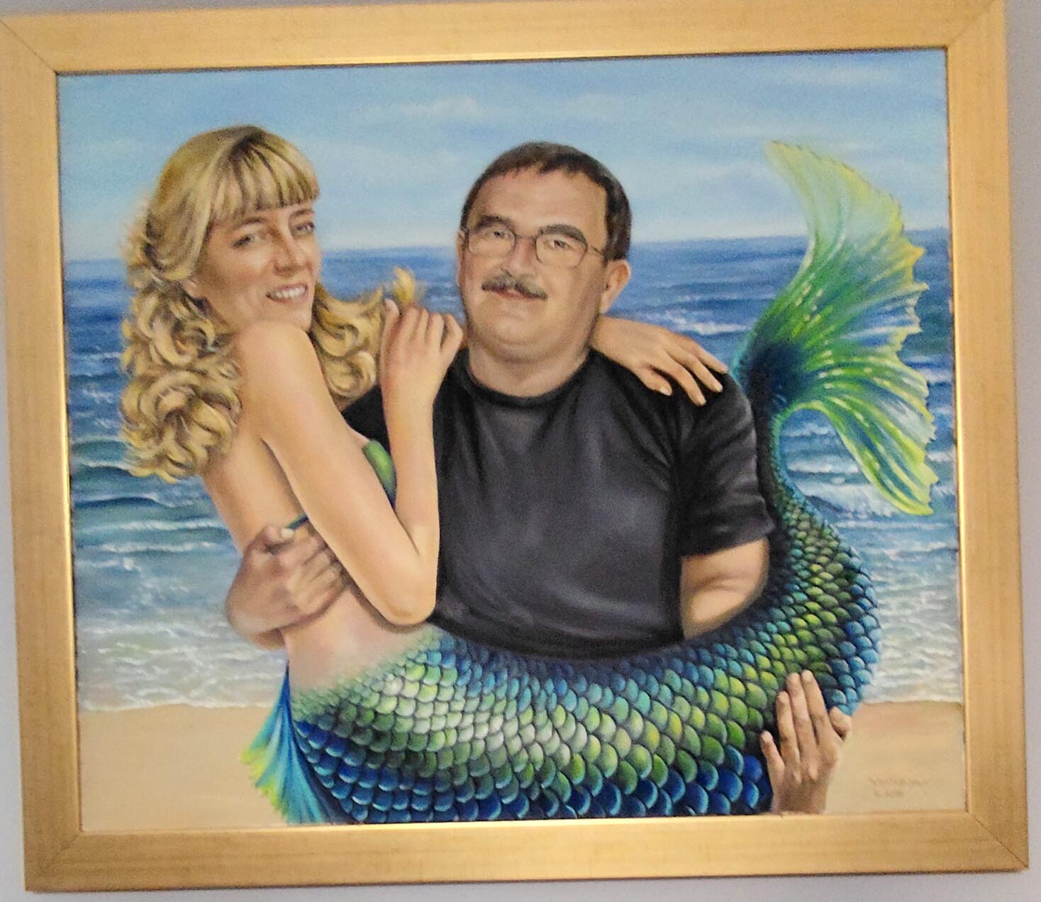 Mają dwoje dzieci i pięcioro wnuków. Osiedli niedaleko Wrocławia w Biedaszkowie Dużym. To ich przystań. Zjeżdżają do nich bliscy i dalsi, i my też z wizytą odwiedziliśmy piękny dworek otoczony krzewami azalii i rododendronów, i pachnącymi świerkami. Zima tego roku, jak za dawnych czasów, może nawet i mroźniejsza, rośliny przyprószone śniegiem, staw skuty lodem, wiszące sople, widok, jak z pocztówki. Gospodarze czekali na nas z orzechowym ciastem oraz gorącą herbatą. Dla kurażu był też kieliszeczek nalewki z czarnej porzeczki. Zasiedliśmy do stołu w salonie, a przed naszymi oczami na ścianie obraz rybaka, który złowił przepiękną blond syrenę. To wizja autora, a w rzeczywistości to oni – Jola i Mirek.