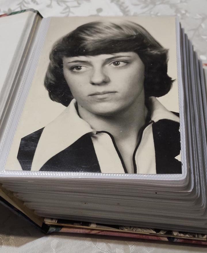 – Tu jest rodzinny album. Ja z domu jestem Heltman. Pierwsze zdjęcie to z okresu panieństwa. Nosił je w portfelu i pokazał swoim rodzicom. Teść stwierdził – charakterna. Czarno-białe zdjęcie na nim blondynka o włosach w naturalnych, falowanych skrętach i duże wyraziste oczy.