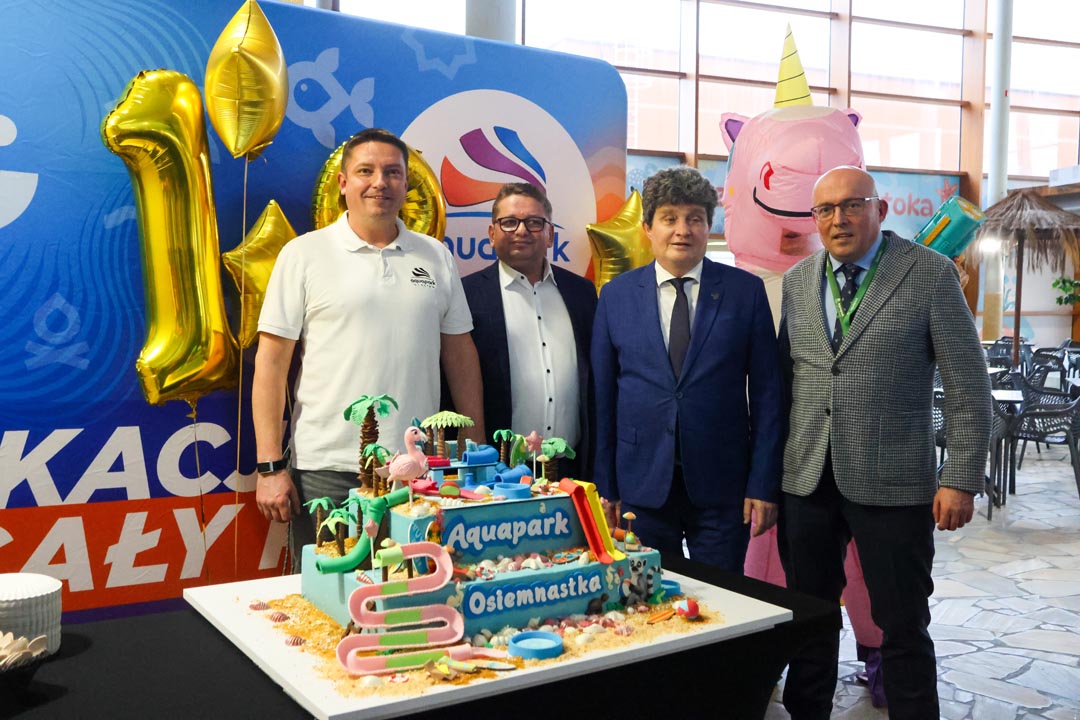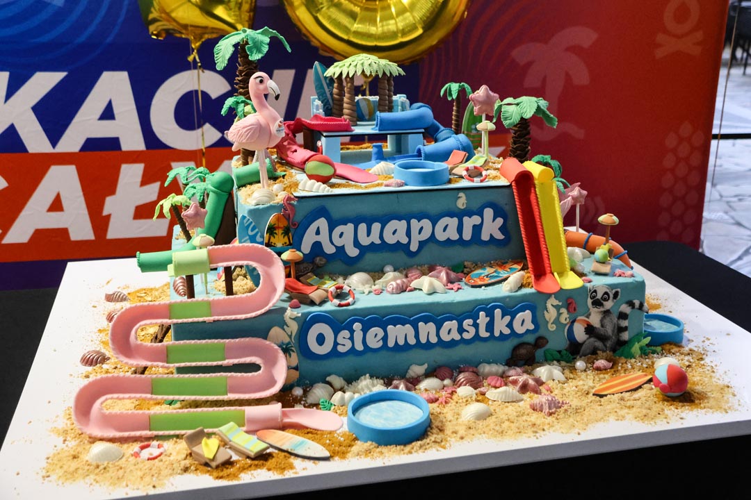 Osiemnaste urodziny to przede wszystkim czas na świętowanie. Stąd w Aquaparku Wrocław pojawił się potężny tort malinowo-pistacjowy (100×80 cm) z elementami nawiązującymi do atrybutów obiektu. Takimi jak zjeżdżalnie. Dzielono nim wszystkich i po równo. W tym Radosława Michalskiego, dyrektora departamentu Marki Miasta i Ryszarda Kesslera, wiceprezydenta Wrocławia odpowiedzialnego za miejską edukację. A to również misja Aquaparku Wrocław, który szkoły i przedszkola odwiedza z programem Bezpieczeństwo nad wodą.