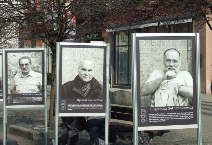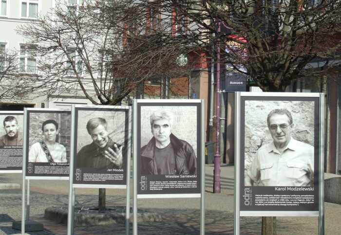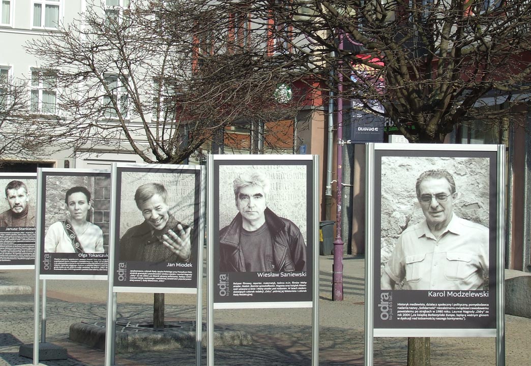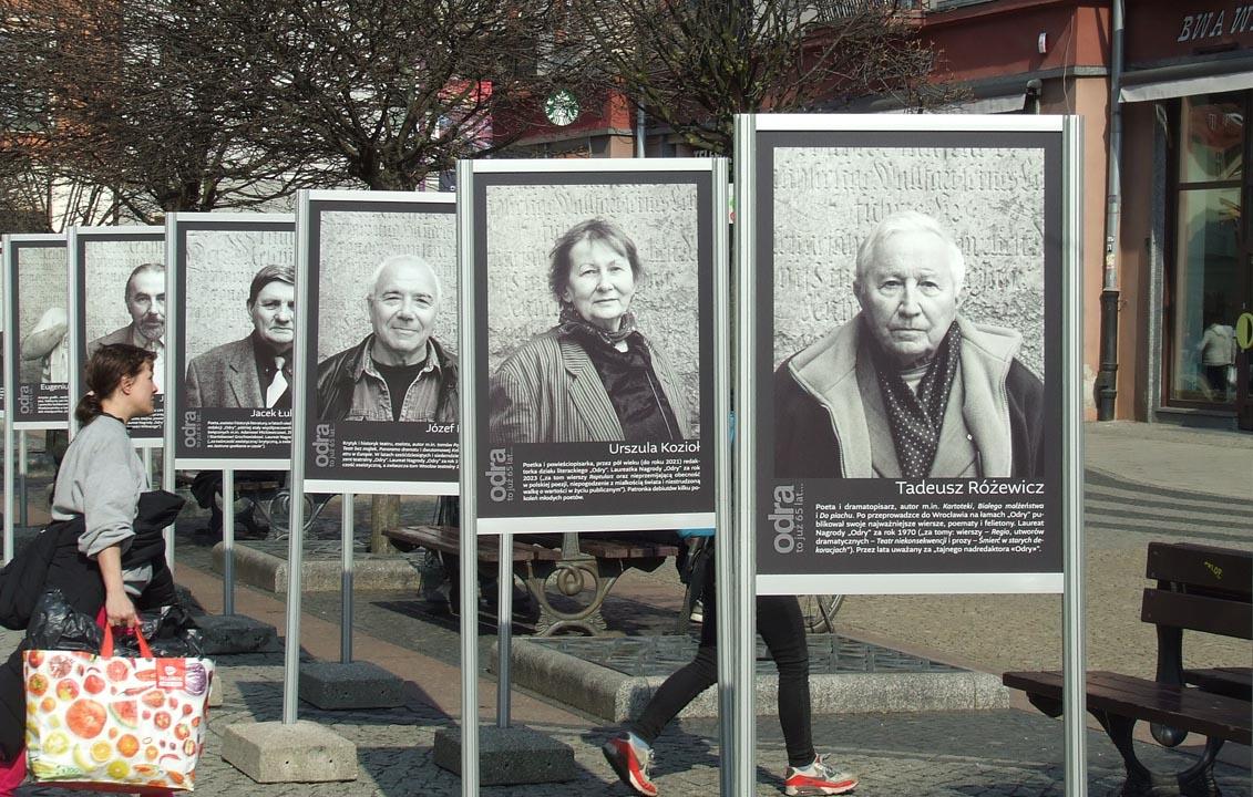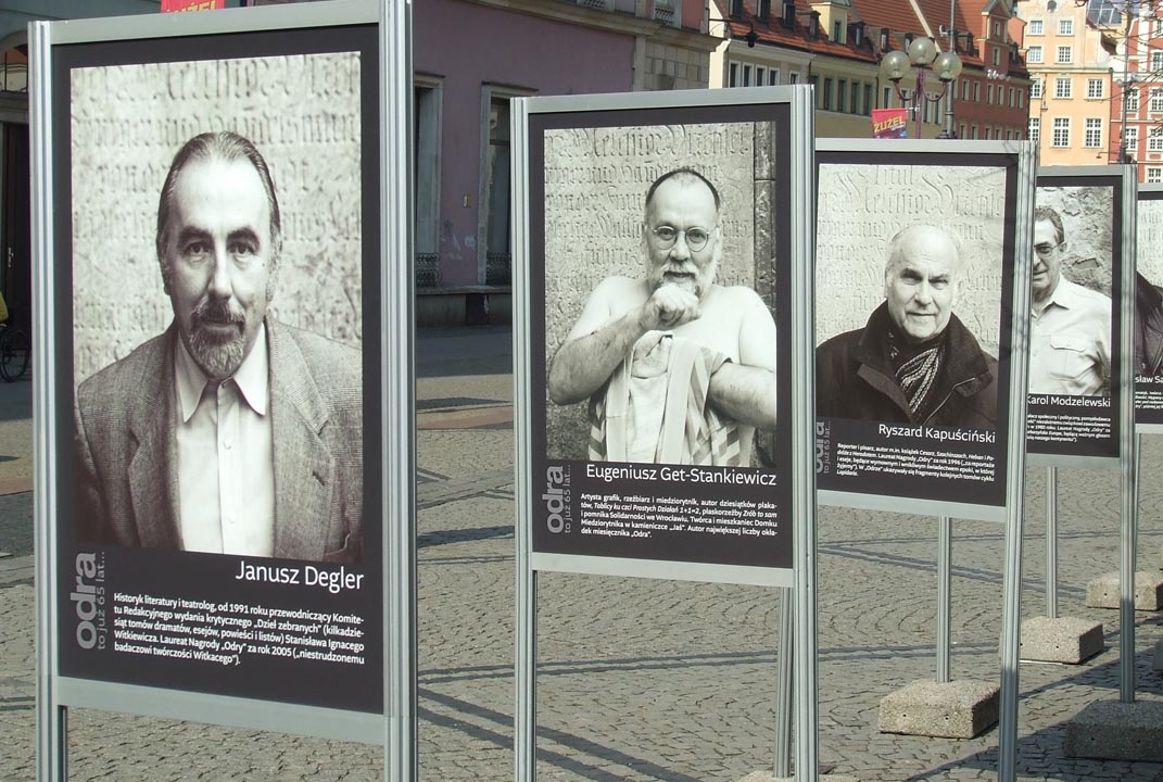 Nie byłbym sobą, gdybym się nie odniósł z paru przyczyn do jubileuszowej galerii zdjęciowej wybranych osobowości, które przez lata gościły na łamach „Odry”. Zacznę od Ryszarda Kapuścińskiego, mego starszego kolegi ze „Słowa Powszechnego”. Drżeliśmy w Warszawie, gdy któryś raz kanałami brytyjskich tajnych służb donosił nam o grożącym mu śmiertelnym niebezpieczeństwie w dziwnych miejscach wojen w Afryce. Profesora Karola Modzelewskiego pierwszy raz widziałem na własne oczy podczas wprowadzania go do suki milicyjnej przed stanem wojennym. Po latach w Głuchołazach natknąłem się na profesora na szlaku kalwaryjskim. Sanatorium, w którym przebywał, dało ulgę jego sercu, jak mi powiedział. Kolejnym wielkim „powieszonym” na planszy „Odry” przy ulicy Świdnickiej jest reżyser Wiesiek Saniewski. Pracował u mojej żony, gdy była dyrektorem Wojewódzkiego Domu Kultury w Opolu. Wspomniałem we wstępie prof. Heinza Kneipa, częstego gościa Tadeusza Różewicza. Dzięki znajomości z Kneipem mogłem z nim odwiedzić Tadeusza Różewicza. No i pozostała plansza z naszą noblistką. Miała sześć lat, gdy przez przypadek znalazłem się w Klenicy, gdzie w Lubuskim Uniwersytecie Ludowym rodzice Oluni byli nauczycielami. Dziewczynka kreśliła coś na papierze. Panu redaktorowi, czyli mnie, oświadczyła: – Jak dorosnę, będą dużo pisać!