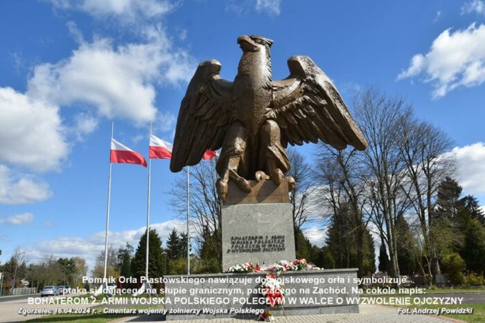 Pomnik Orła Piastowskiego, nawiązuje do sylwetki wojskowego orła i symbolizuje ptaka siadającego na słupie granicznym, patrzącego dumnie na Zachód. Rzeźba ta góruje nad cmentarzem, gdzie znajdują się groby poległych żołnierzy polskich w czasie operacji łużyckiej. Cmentarz ma kształt prostokąta otoczonego wałem, podzielonego na symetryczne 4. kwatery. Na skrzyżowaniu głównej alei stoi cokół po pierwszym pomniku.