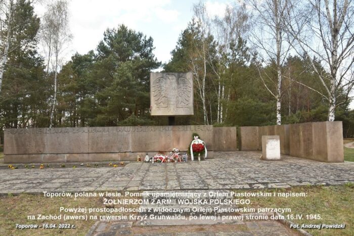 W Toporowie obchody będą miały charakter lokalny. Tutaj wspólnie społeczność gmin: Pieńsk i Węgliniec przypomni o odwadze i poświęceniu żołnierzy 2 AWP walczących o wolność Polski na tej ziemi. Uroczystość odbędzie się na polanie leśnej w nieistniejącej wsi Toporów/Prędocice przy monumencie – pomniku z napisem: ŻOŁNIERZOM 2 ARMII WOJSKA POLSKIEGO i górującym nad nim dużym kamiennym prostopadłościanem z reliefami (płaskorzeźbami) na jego bokach: na awersie Orzeł Piastowski patrzącego na Zachód, a na rewersie Order Krzyża Grunwaldu. Ponadto na bocznych ścianach prostopadłościanu, z lewej i prawej strony, widnieje data 16.IV.1945. Monument przypomina historię oręża polskiego na tej ziemi i oddaje hołd żołnierzom Wojska Polskiego poległym podczas operacji forsowania Nysy Łużyckiej rozpoczętej 16 kwietnia 1945 roku.