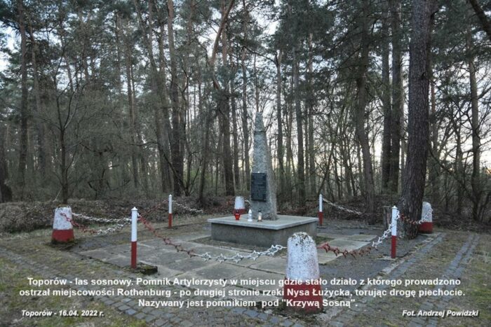 W pobliżu jest też Pomnik Artylerzysty, postawiony w miejscu gdzie znajdowało się stanowisko bojowe działonu 6 bat. z 56. pułku artylerii przeciwpancernej należącego do 9. Brygady Artylerii Przeciwpancernej. Działon prowadził ostrzał miejscowości Rothenburg znajdującej się na lewym brzegu Nysy Łużyckiej, torując drogę piechocie.