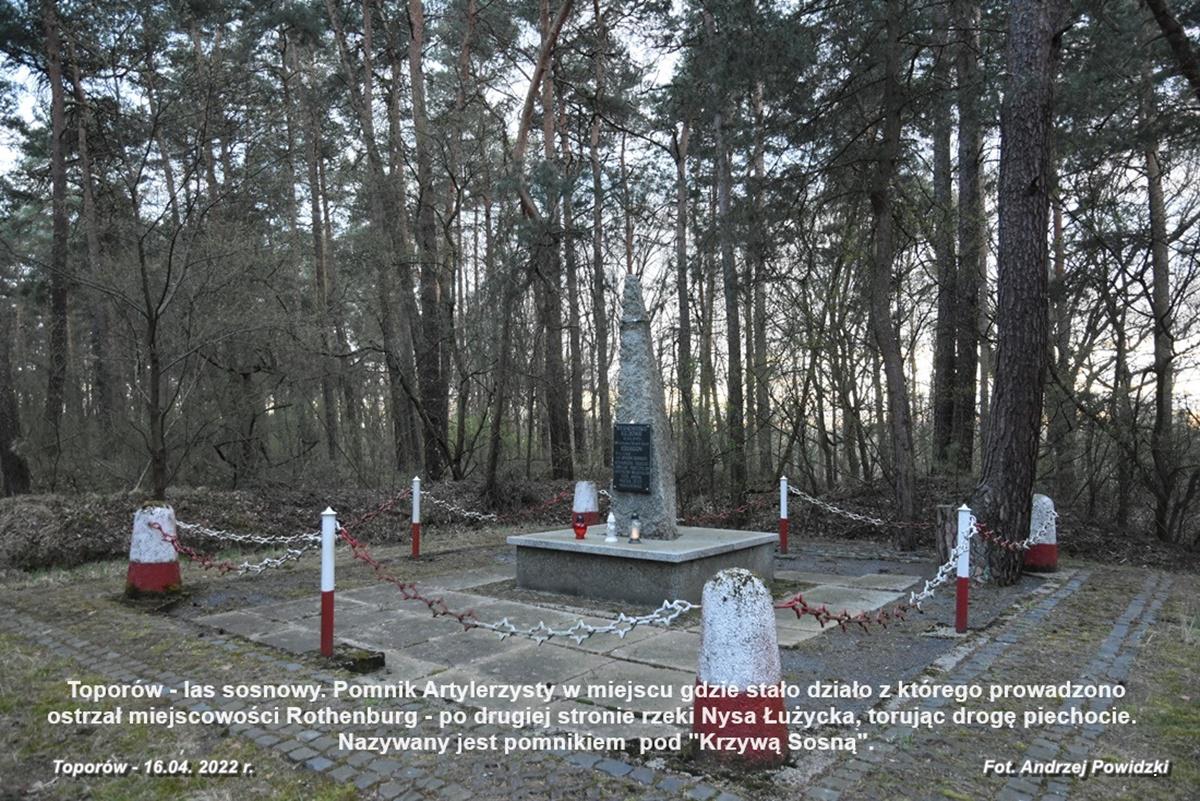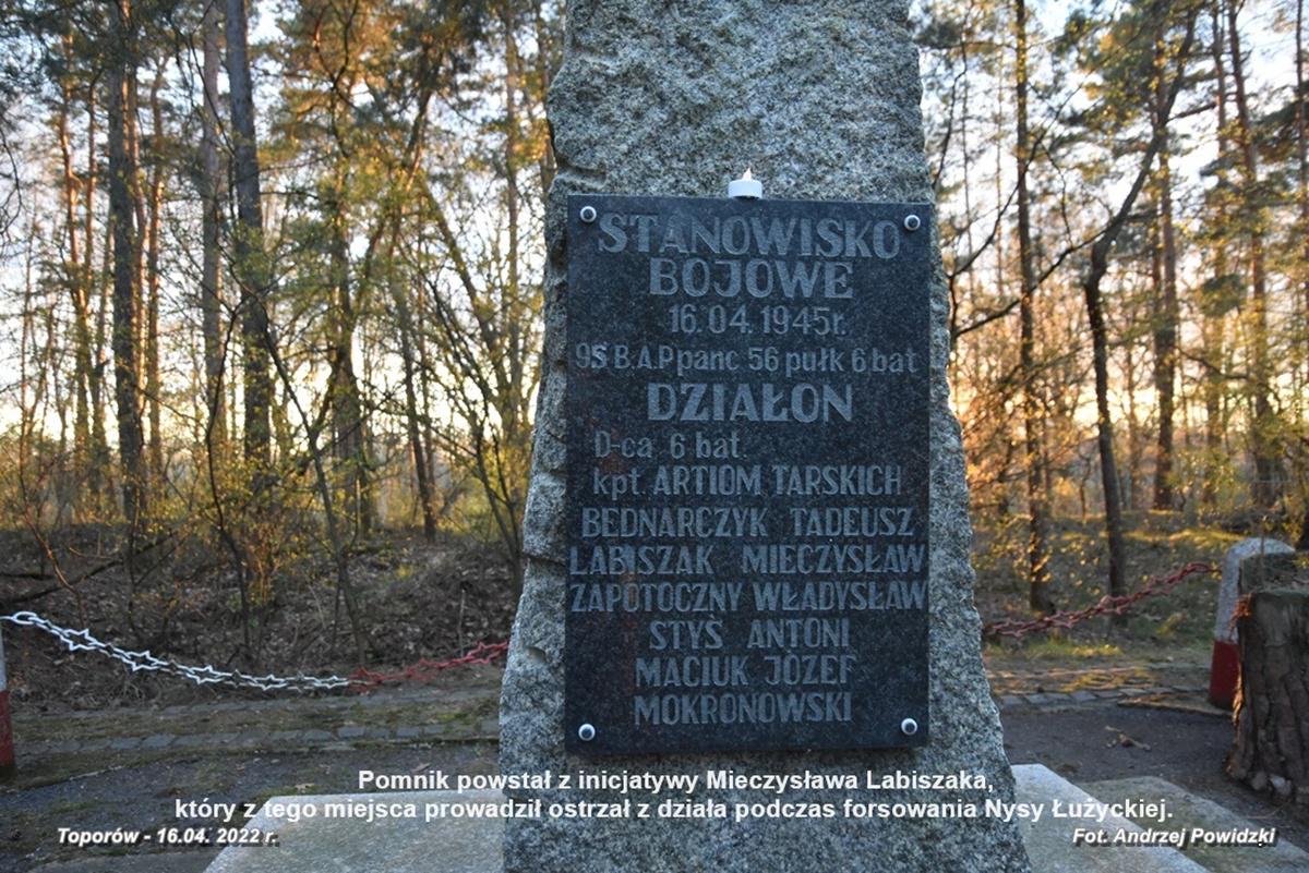 W Toporowie obchody będą miały charakter lokalny. Tutaj wspólnie społeczność gmin: Pieńsk i Węgliniec przypomni o odwadze i poświęceniu żołnierzy 2 AWP walczących o wolność Polski na tej ziemi. Uroczystość odbędzie się na polanie leśnej w nieistniejącej wsi Toporów/Prędocice przy monumencie – pomniku z napisem: ŻOŁNIERZOM 2 ARMII WOJSKA POLSKIEGO i górującym nad nim dużym kamiennym prostopadłościanem z reliefami (płaskorzeźbami) na jego bokach: na awersie Orzeł Piastowski patrzącego na Zachód, a na rewersie Order Krzyża Grunwaldu. Ponadto na bocznych ścianach prostopadłościanu, z lewej i prawej strony, widnieje data 16.IV.1945. Monument przypomina historię oręża polskiego na tej ziemi i oddaje hołd żołnierzom Wojska Polskiego poległym podczas operacji forsowania Nysy Łużyckiej rozpoczętej 16 kwietnia 1945 roku.